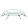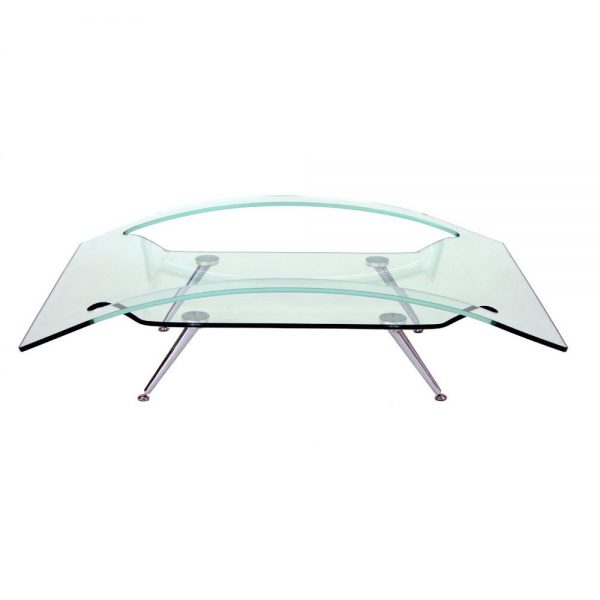 This sleek & contemporary coffee table is made of bend glass with chrome steel legs.