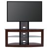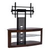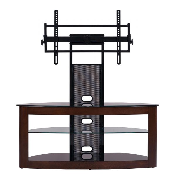 Cured wood TV stand with universal mounting system and 3 audio video component shelves for most of the 35″ – 85″ Plasma, LCD/LED TVs