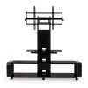 The stand is crafted with heavy-duty, scratch-resistant steel in a sleek black gloss finish and a stylish bend engineered hardwood in a gloss black finish, adding both functionality and style to your space. The tempered safety glass shelves provide ample storage for your audio video components, including a center channel speaker or sound bar, while the integrated cable management system keeps unsightly wires and cables hidden.